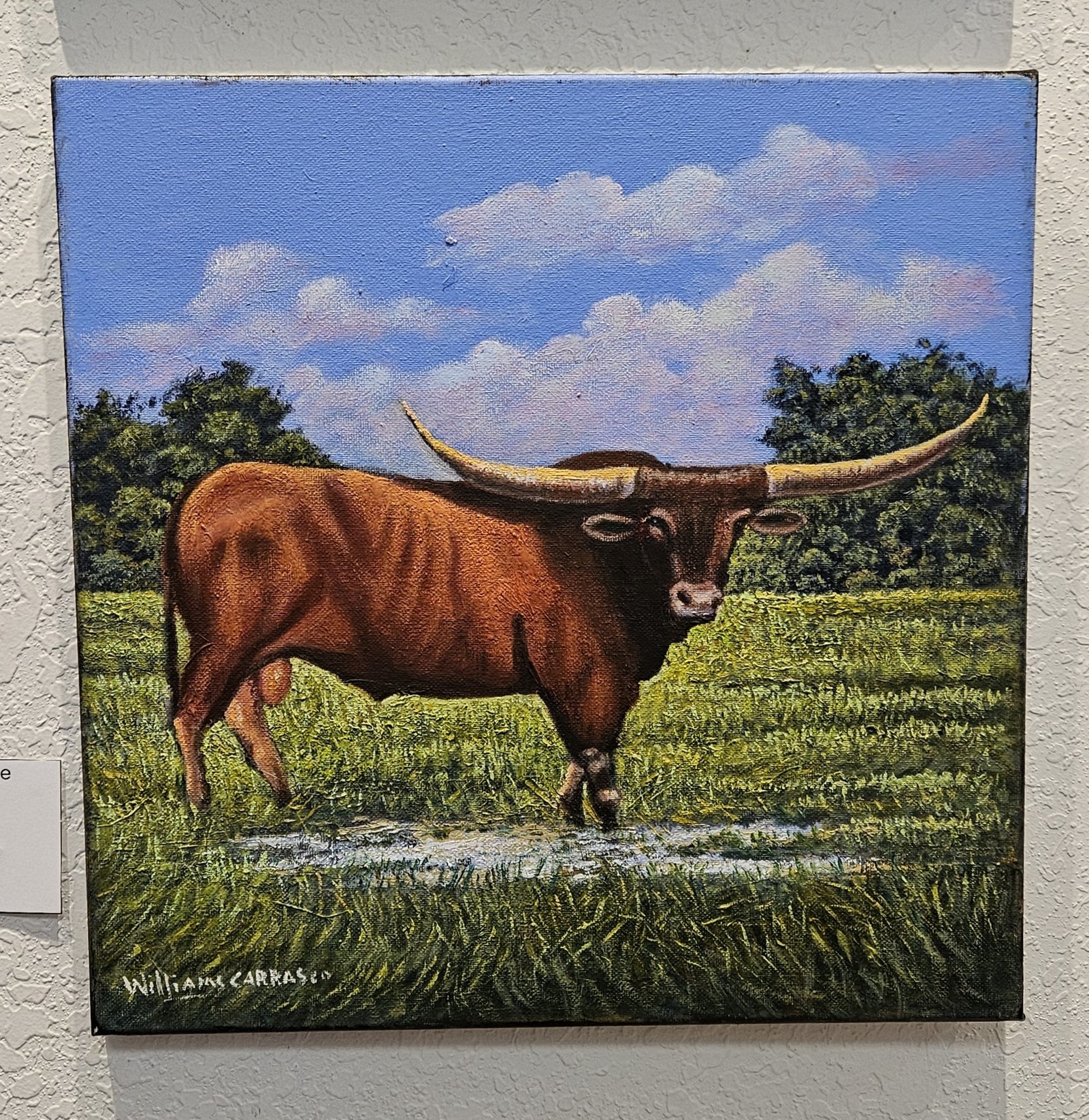 Oil painting in a green field with a clear sky in the background.